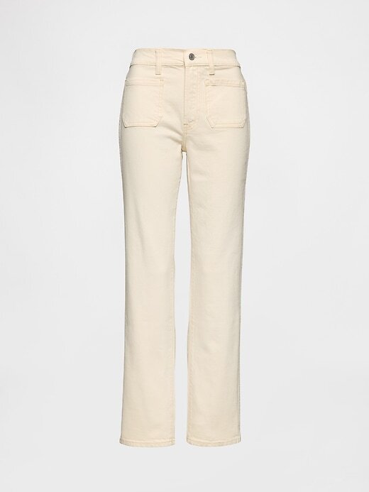 • Visual: Um jeans clássico de cinco bolsos em uma lavagem bege areia.