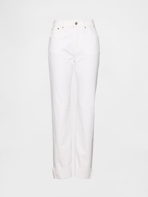 - Visual: Um jeans reto clássico de cinco bolsos em uma lavagem branca óptica.