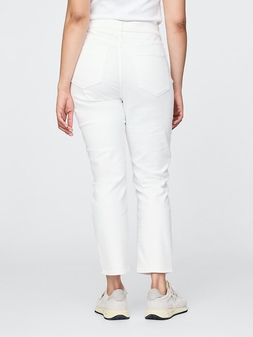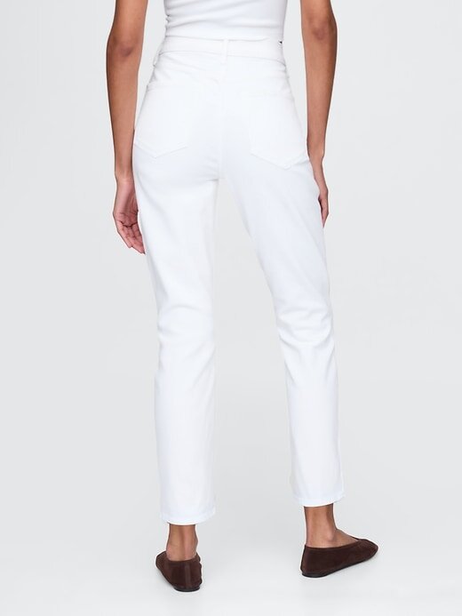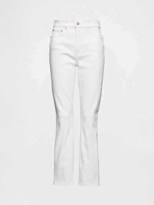 - Visual: Uma calça jeans clássica de cinco bolsos com lavagem branca.
