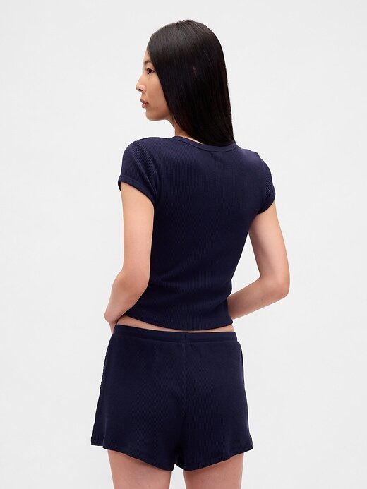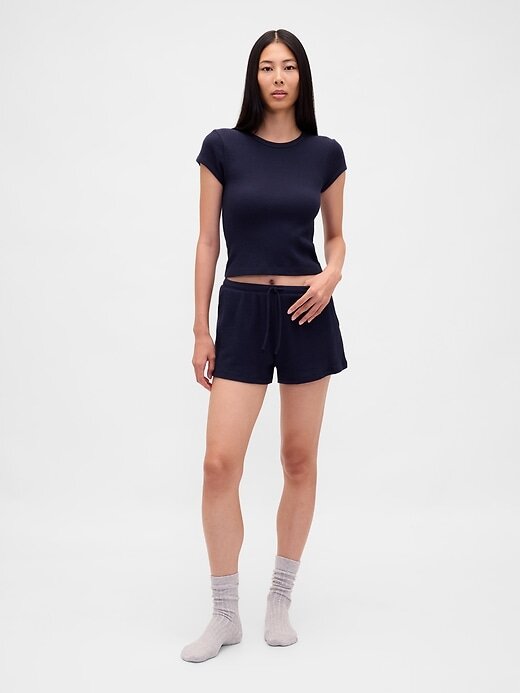 - Camiseta de pijama em malha waffle escovada, macia e aconchegante, com comprimento ligeiramente curto.