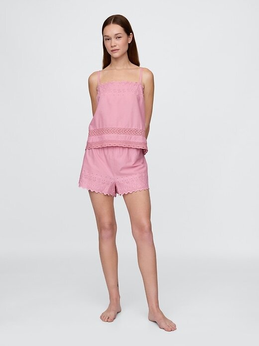 - Cintura elástica com cordões no short de pijama.