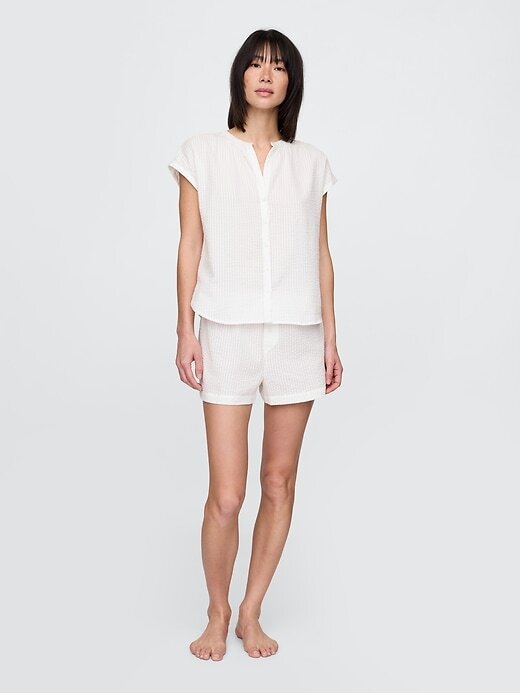 - Conjunto de pijama e shorts em gaze de algodão macio e texturizado.