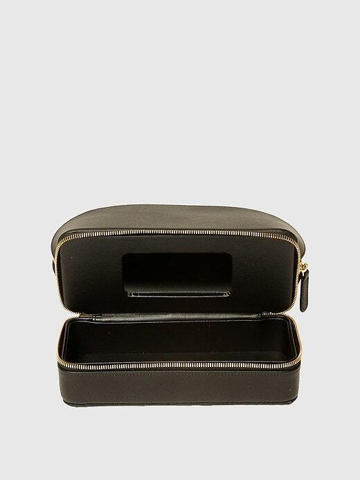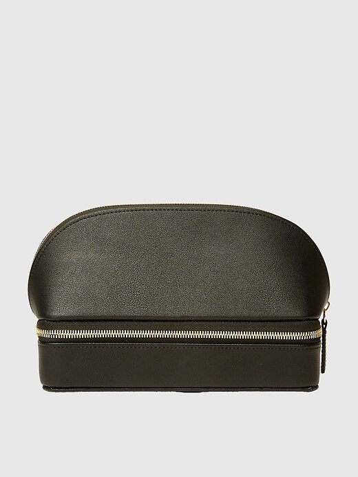 - Esta solução de armazenamento de viagem Brouk and Co Abbey Travel Cosmetic Case da Brouk and Co tem um bolso com zíper na parte superior para seus itens essenciais do dia a dia, o compartimento inferior abre para revelar um espaço de armazenamento para colares, brincos, pulseiras e anéis.