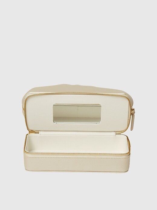 • Esta solução de armazenamento de viagem Brouk and Co Abbey Travel Cosmetic Case da Brouk and Co tem um bolso com zíper na parte superior para seus itens essenciais do dia a dia, o compartimento inferior abre para revelar um espaço de armazenamento para colares, brincos, pulseiras e anéis.