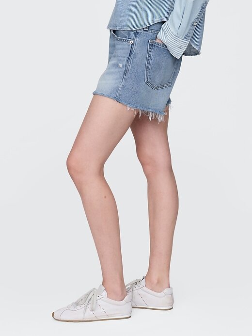 • Visual: Um short jeans clássico de cinco bolsos em uma lavagem índigo clara.