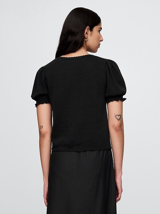 • Mangas curtas bufantes com punhos canelados e babados.