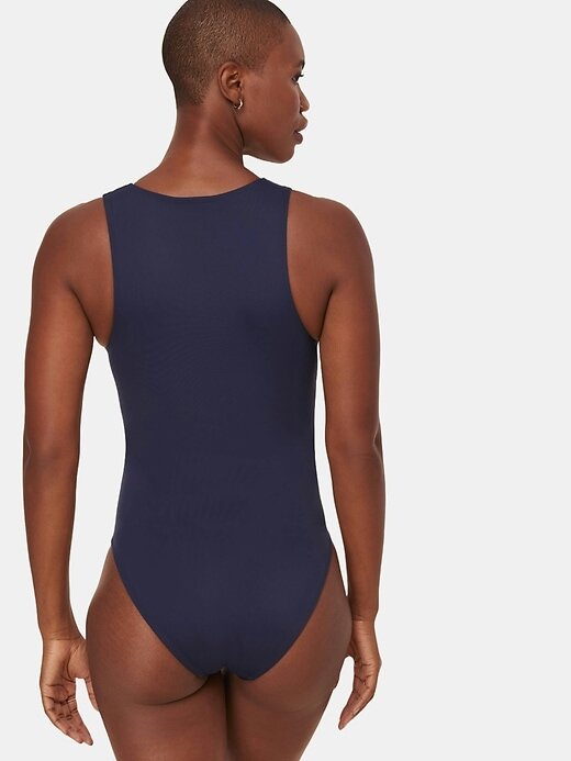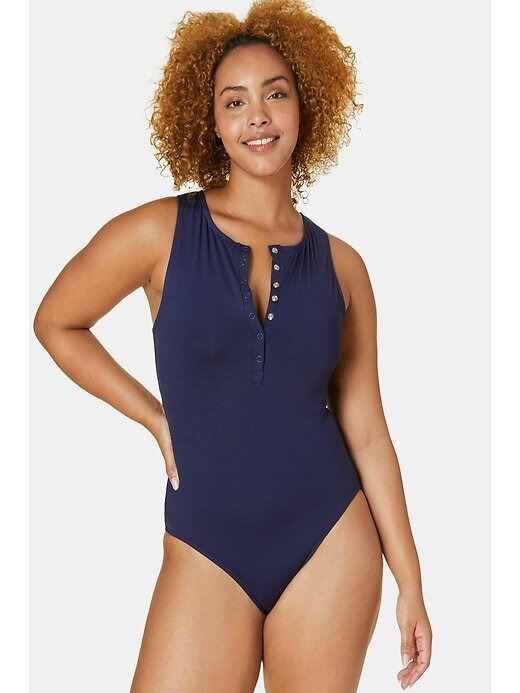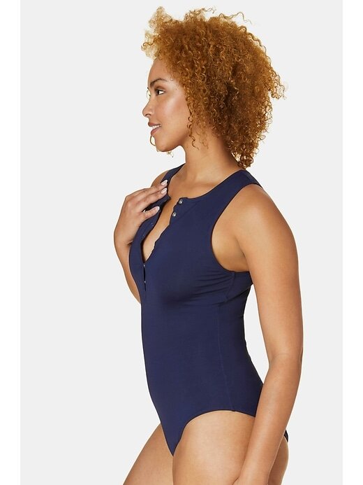 - Divertido e flexível, este maiô é uma mistura descontraída de esportivo e sexy, com um decote alto frontal com botões de pressão para uma perfeição versátil.