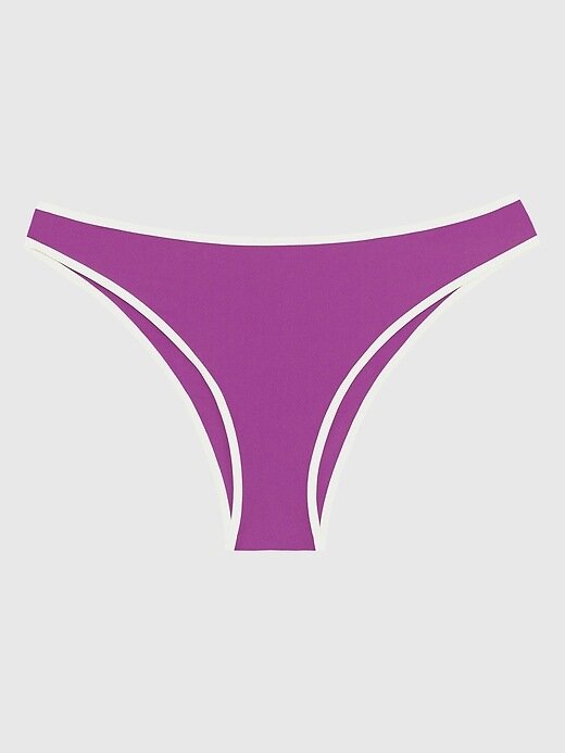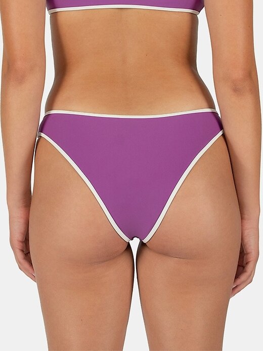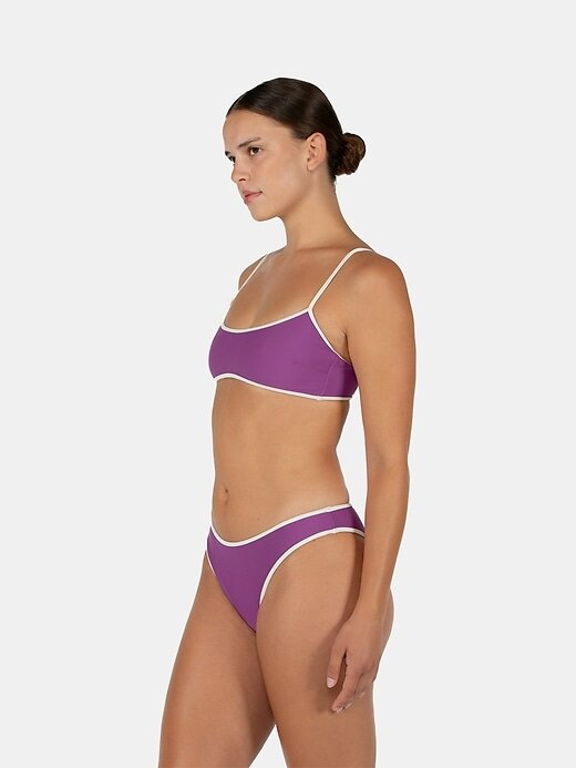 - Bruna, uma calcinha de perna alta com acabamento cru e cobertura mínima.