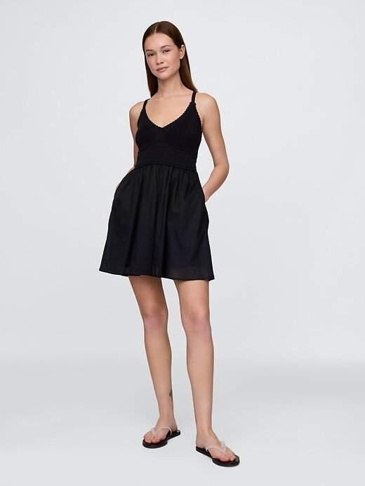 - Top de malha de crochê macio com saia de voil de algodão e minivestido de técnica mista.