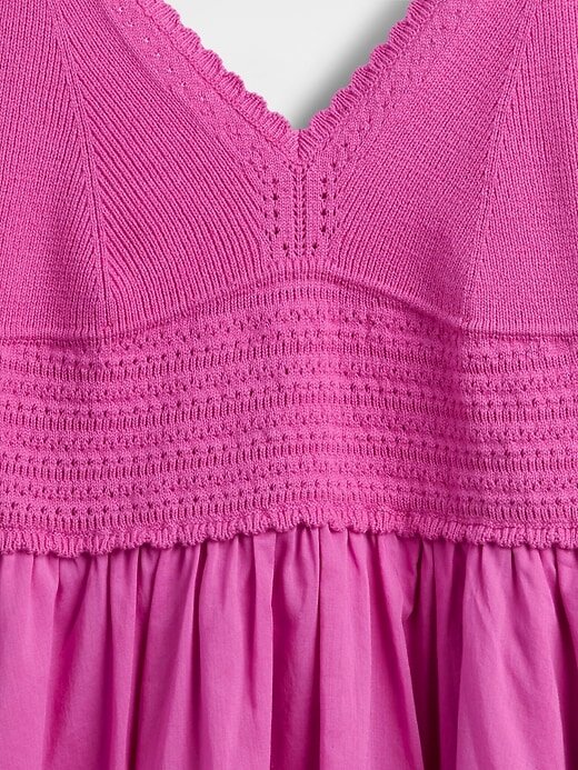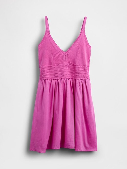 - Top de malha de crochê macio com saia de voil de algodão e minivestido de técnica mista.