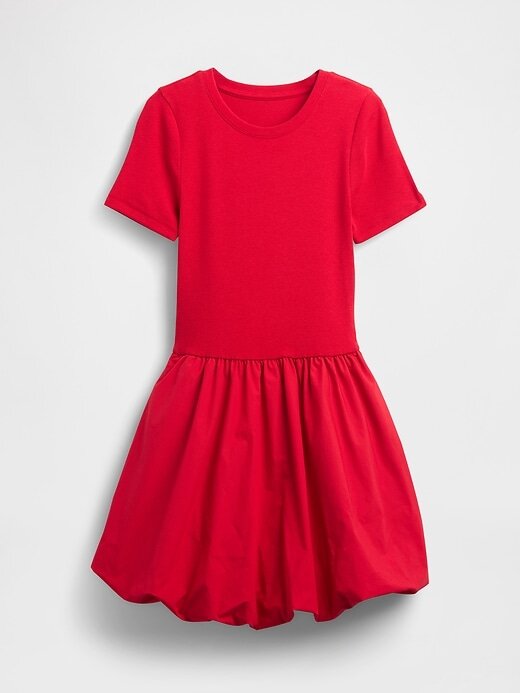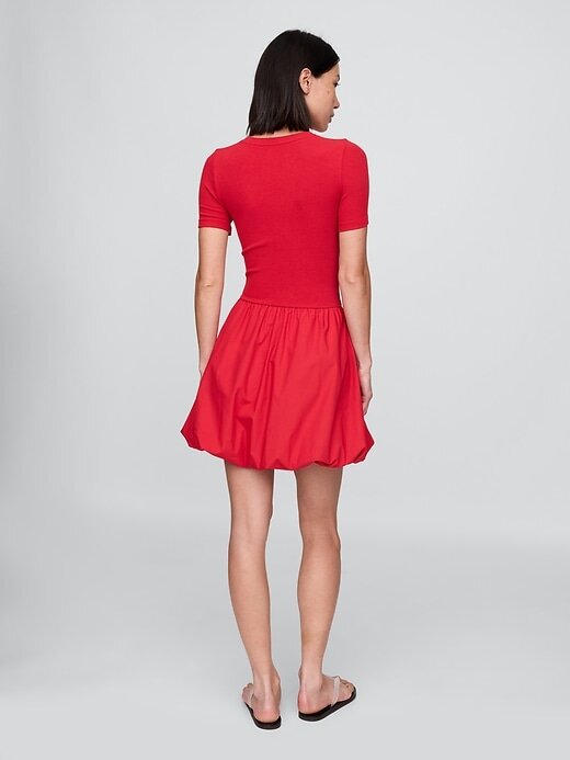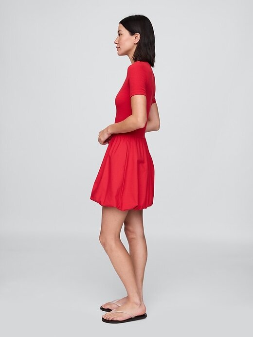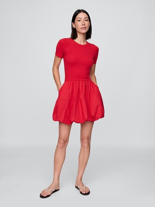 • Camiseta supermacia em mistura de modal com minivestido em popeline de algodão com saia bolha.