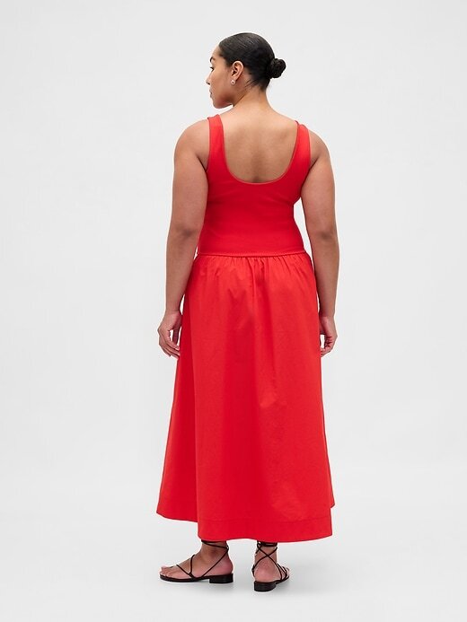 - Top canelado macio e pesado com saia de popeline de algodão fresco e vestido longo de mídia mista.
