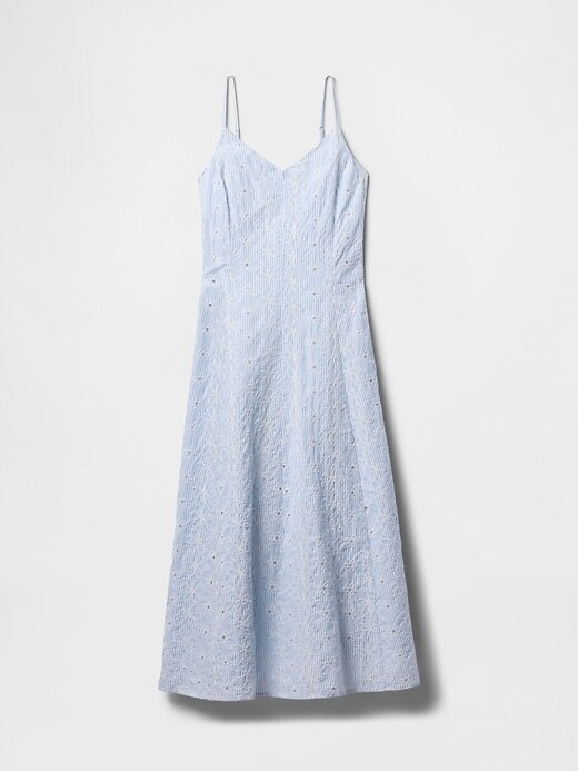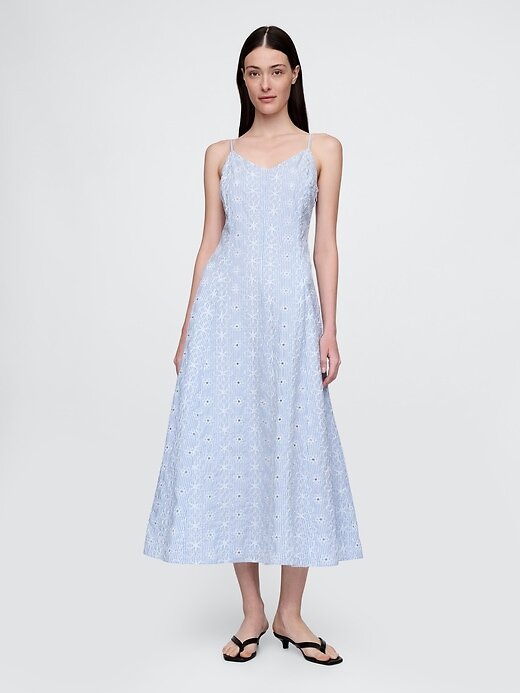 • Vestido midi de algodão macio com bordado de ilhós por toda a peça.